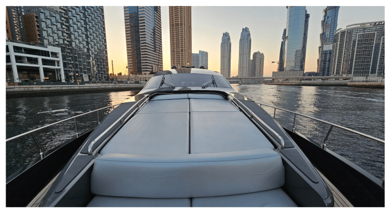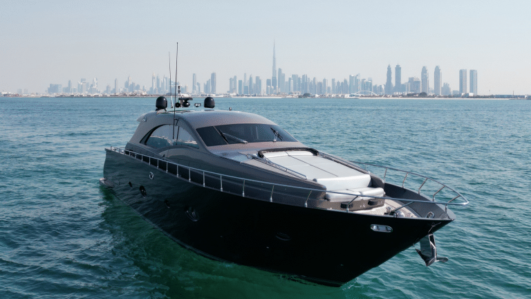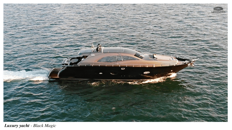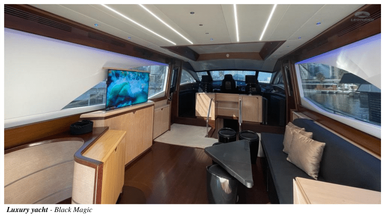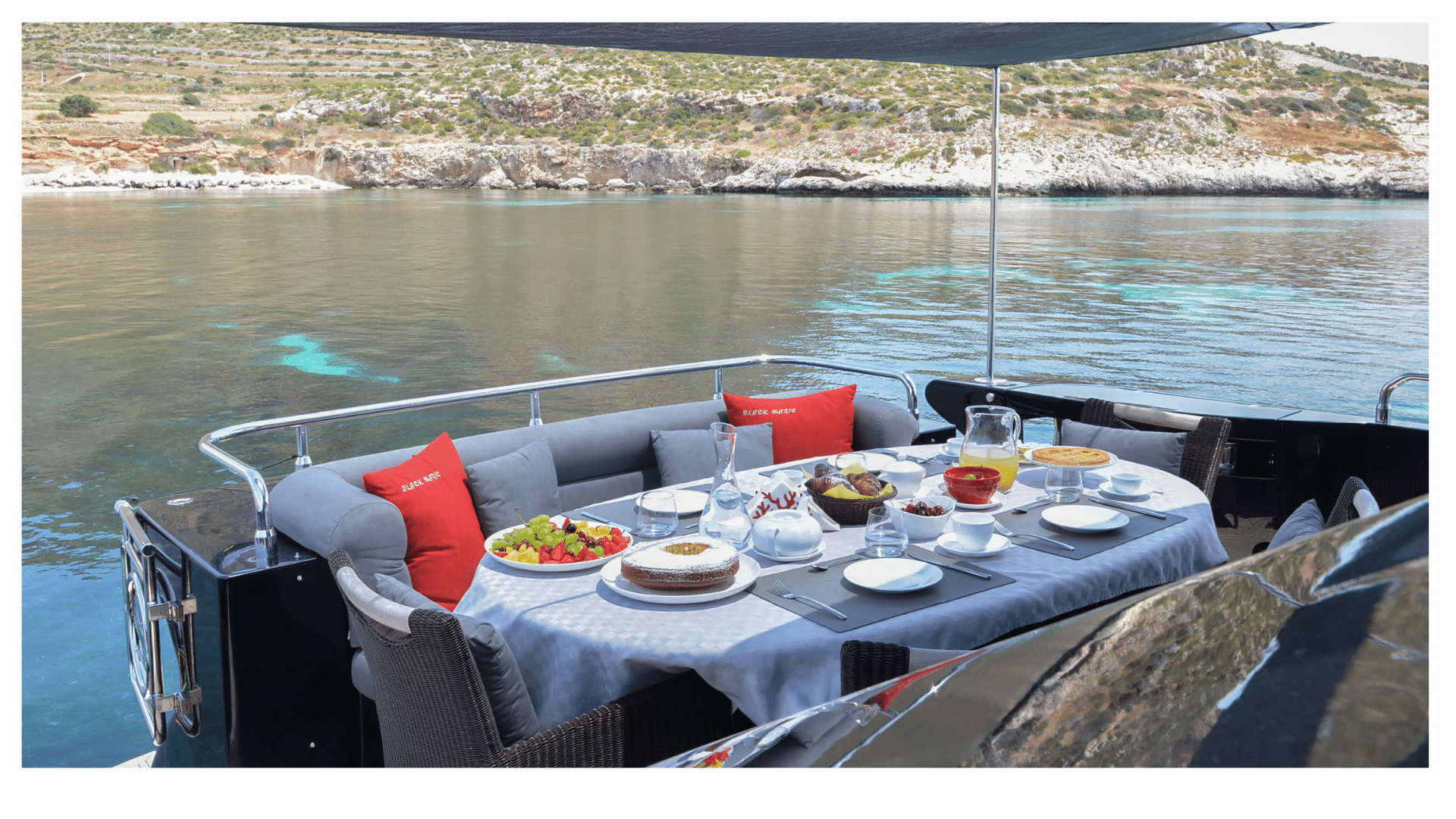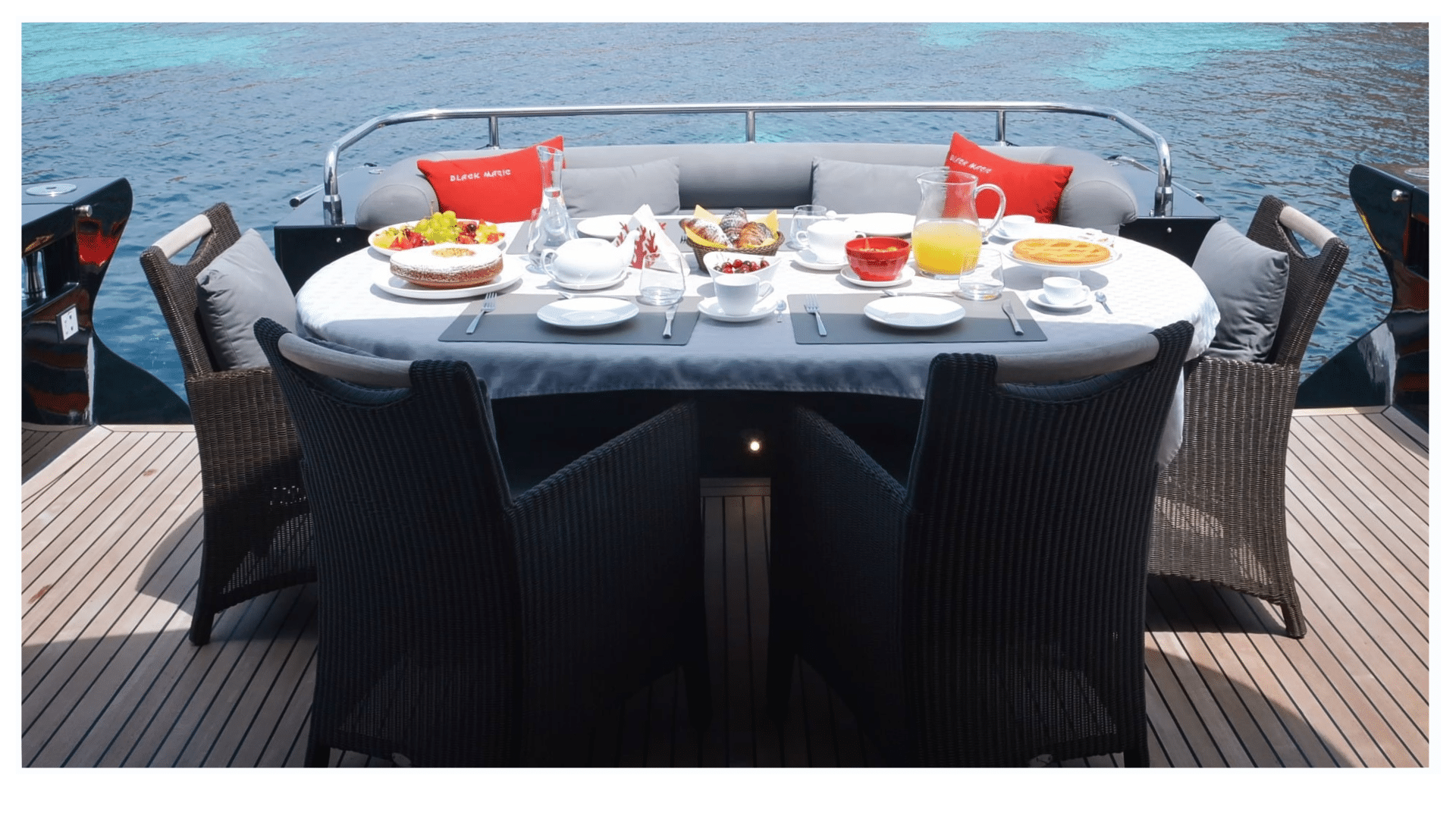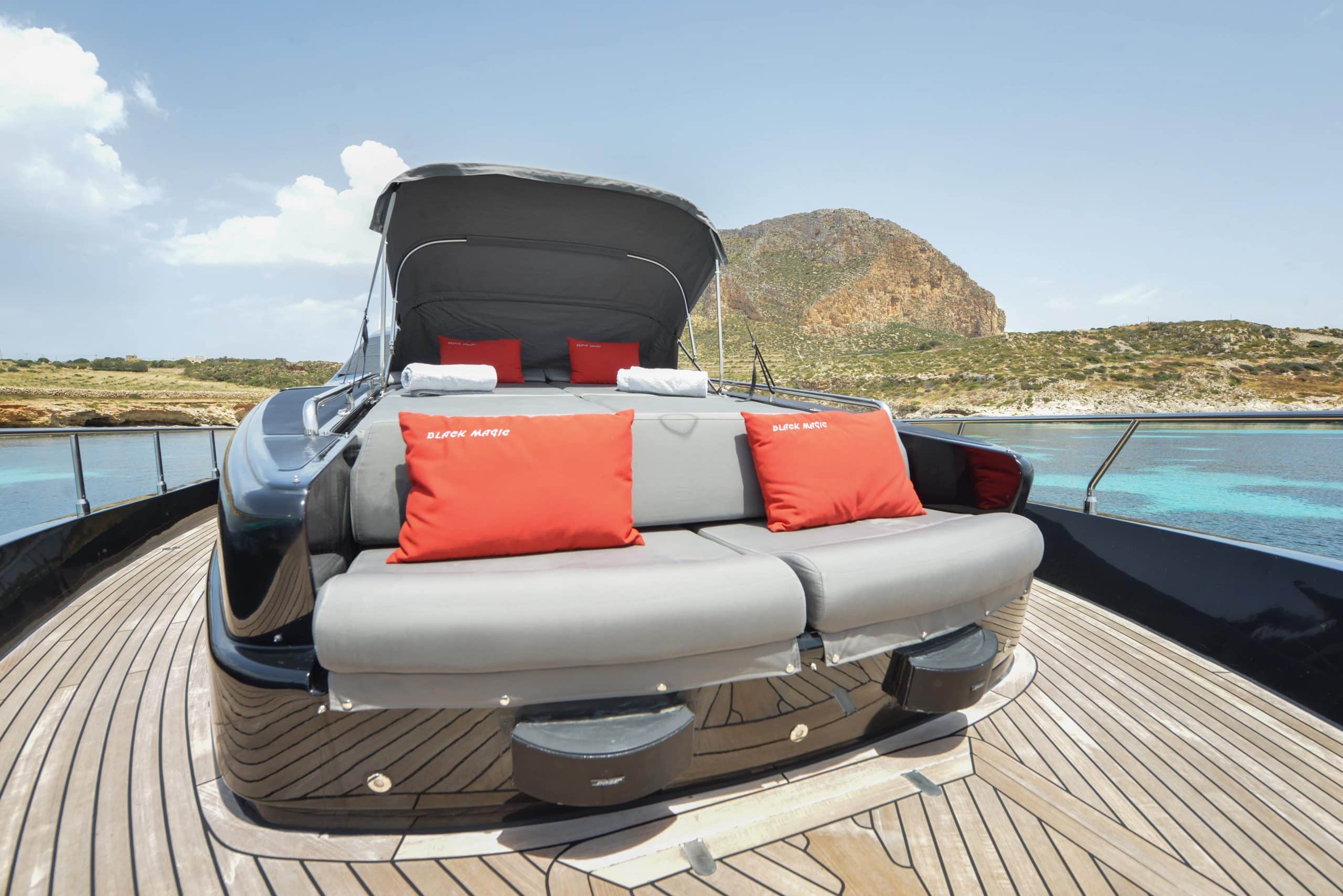 The Black Magic features a spacious sundeck located at the bow, offering ample space for relaxation under the sun. Two gangways lead to the stern, where guests can discover a distinctive open area furnished with a comfortable sofa, providing direct access to the sea.
