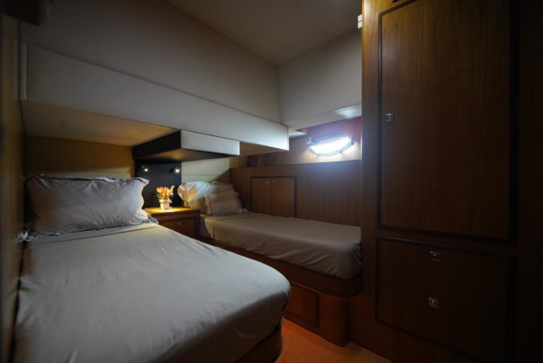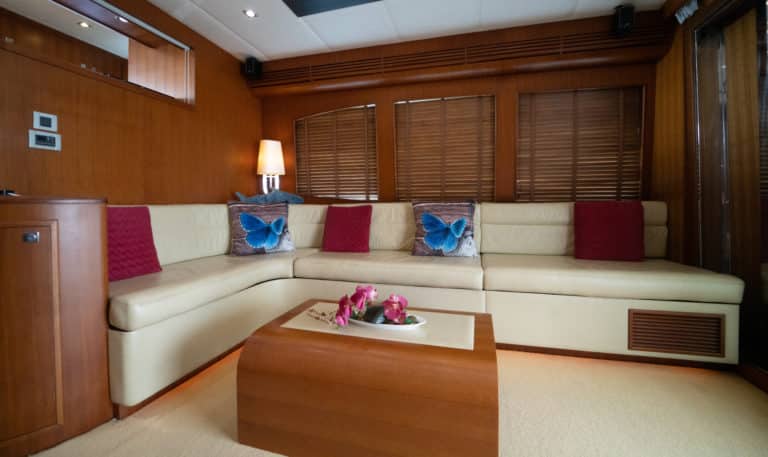 A sliding glass door separates the saloon from the cockpit, keeping engine noise at bay. In the saloon, entertainment reigns with a large TV-DVD, bar, and an adjustable cherry wood coffee/dining table. Leather-covered chairs and discreet lighting create an ambiance of luxury.