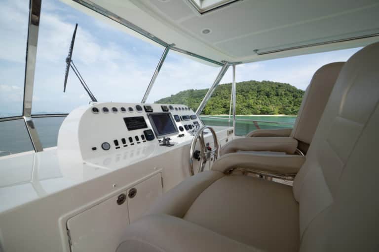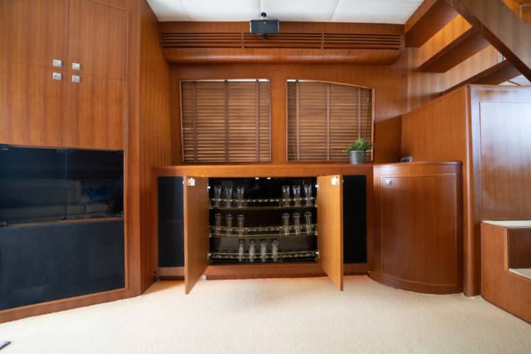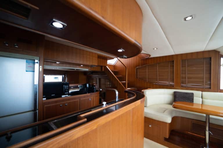 Ascending to the pilothouse, you’ll find a well-equipped galley and the main helm station. The helm boasts twin 15″ Simrad CX50 screens for radar, chart plotter, and sonar displays. The galley features full-size domestic appliances, including a dishwasher, and a granite countertop.