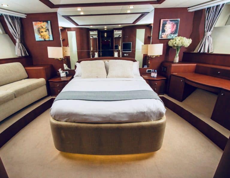 There’ll be plenty to keep you occupied and entertained on your charter, including a deck jacuzzi where you can relax and take in the landscape while sipping your favorite beverage. With Medusa, you can host a 25-person event comfortably. It also has four spacious cabins that accommodate 8 people overnight.
