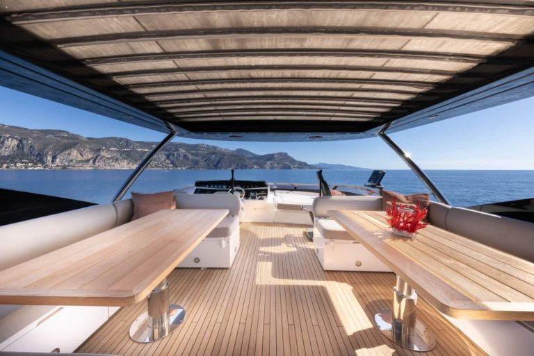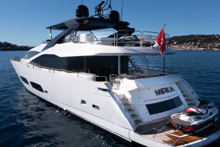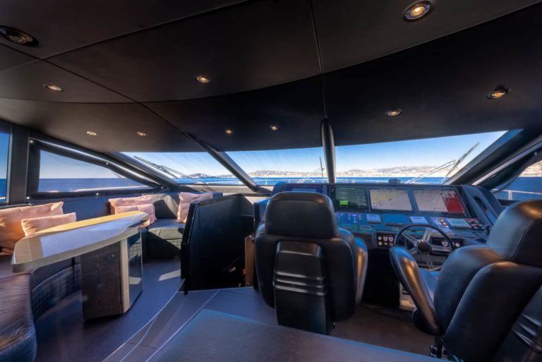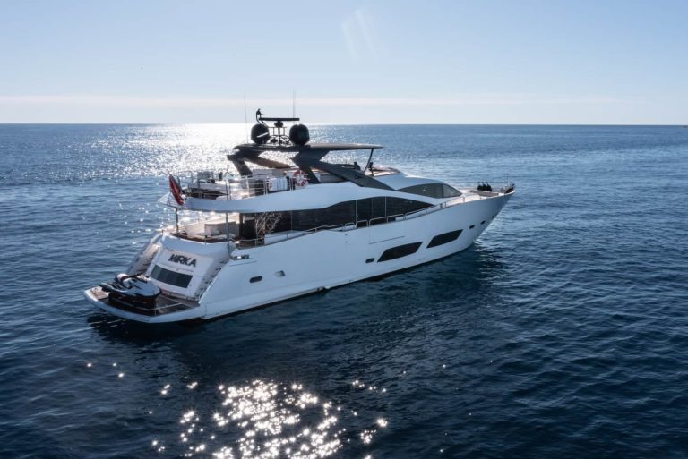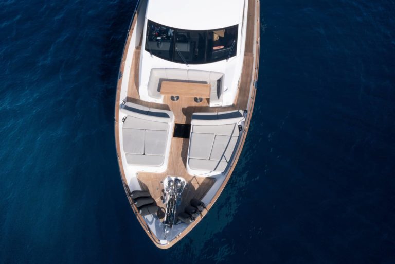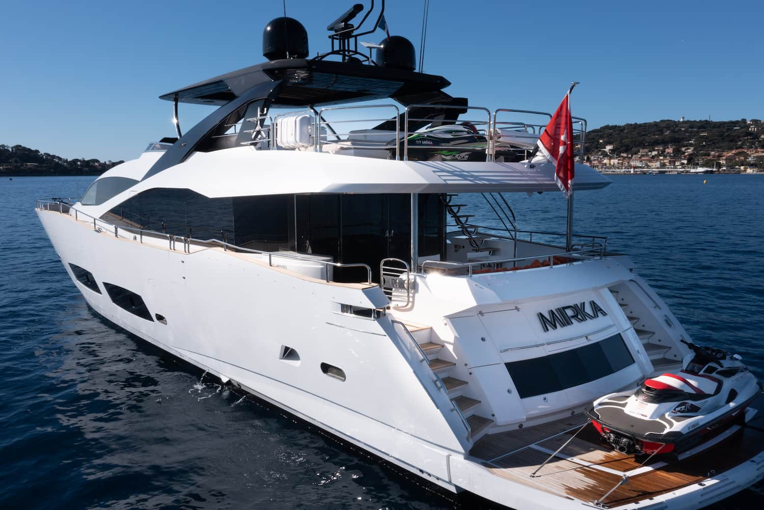The interior is superbly attractive, spacious, elegant and benefits from wraparound glazing and full height windows that give you an undisrupted panoramic view through an optional drop-down saloon balcony. For those who love to stay connected while at sea, the Mirka offers a Starlink WiFi system and new sound system who delivers an unparalleled listening experience, with crystal clear sound. The dining area is ultra-modern, with clever use of space. On the foredeck, there are large sunpads and comfortable seating areas, perfect for al fresco dining. Overall, Mirka is a true masterpiece, blending speed, luxury, and comfort seamlessly for an unforgettable yachting experience
