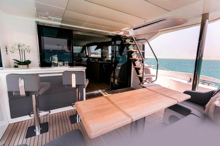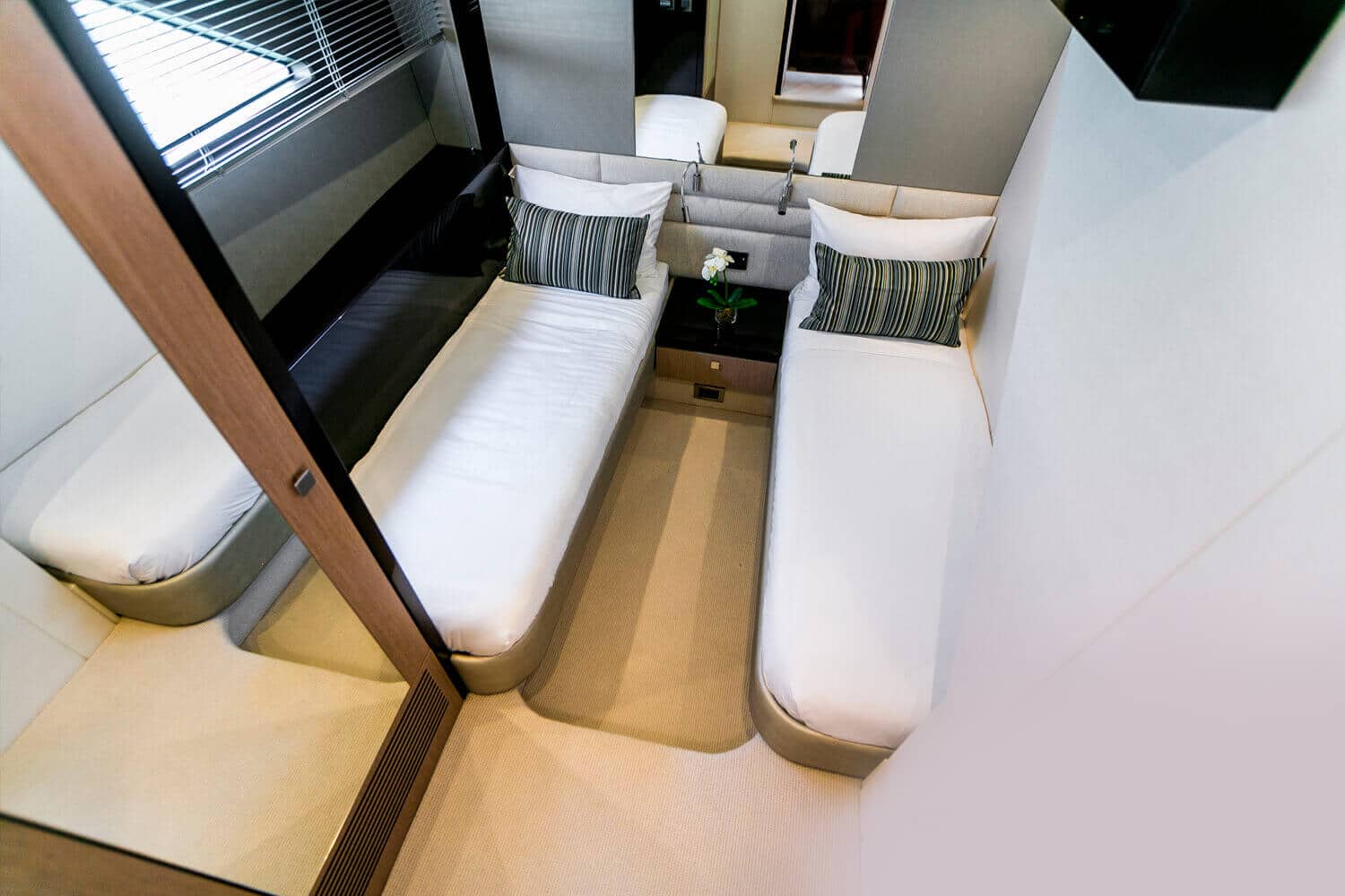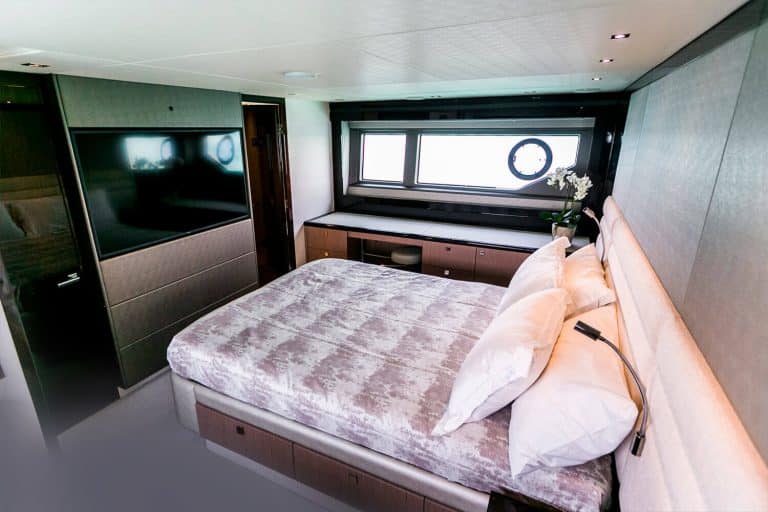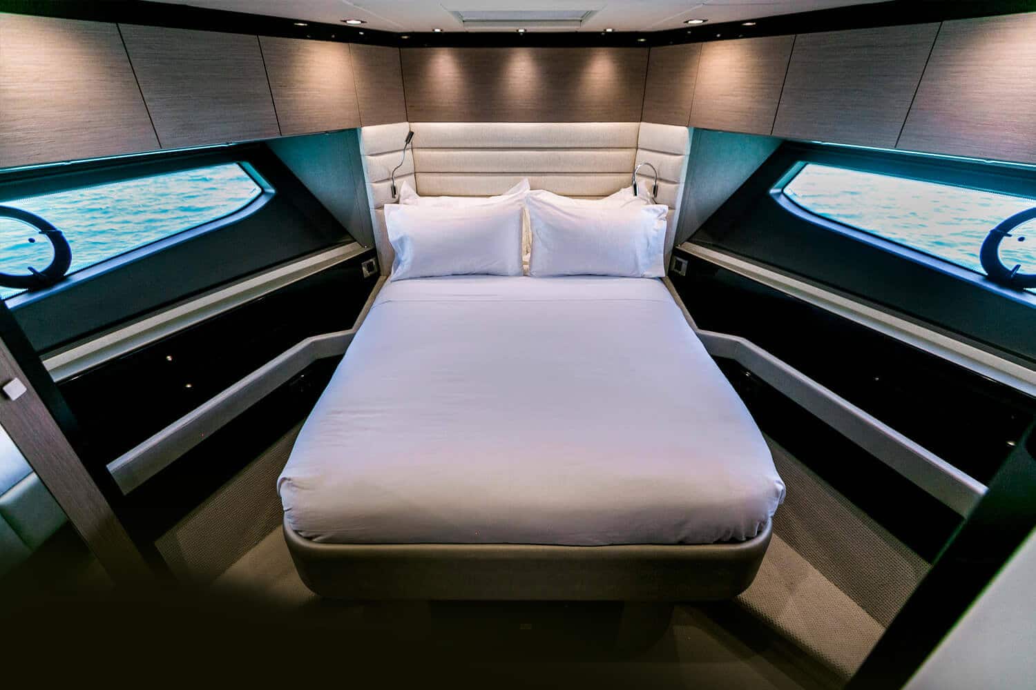 The full-beam master suite is located at the aft of the yacht and includes a large bed, ample storage space, and an en-suite bathroom. VIP staterooms and additional guest cabins also have en-suite bathrooms, ensuring comfort for all guests. The yacht's exterior deck spaces are perfect for both relaxation and entertainment, with a large aft flybridge, a forward sun pad and lounge area, and dining and seating areas.