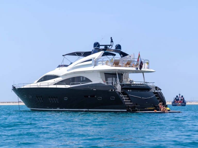 Notorious, built by the British yard Sunseeker International, features an enormous flybridge with ample space for socializing and sunbathing as well as plenty of seating to enjoy a sunset barbeque.