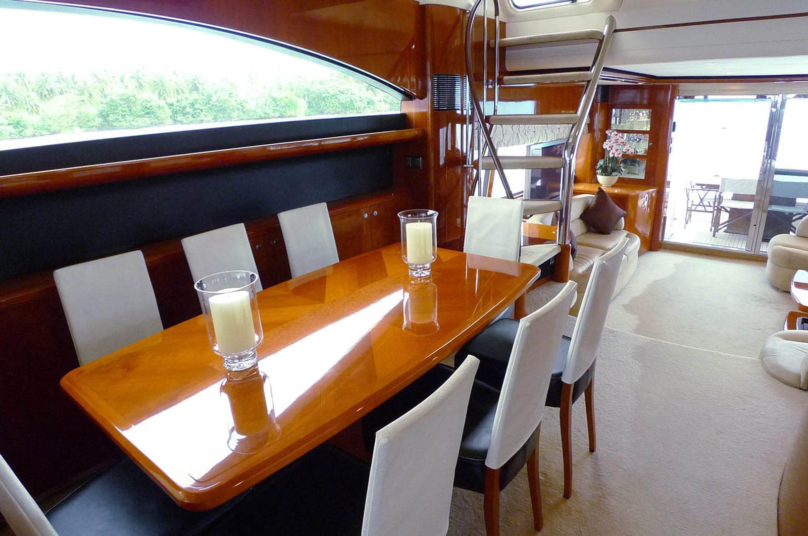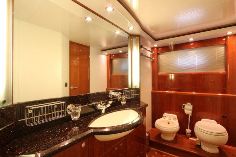 All cabins, salon, galley, and office have individual air conditioning controls and telephone access to the boat’s internal system. The galley can transform into an entertaining bar with an electronically retractable sliding cherry wood partition. The main salon’s electronically opened glass rear partition creates an open and inviting ambiance.
