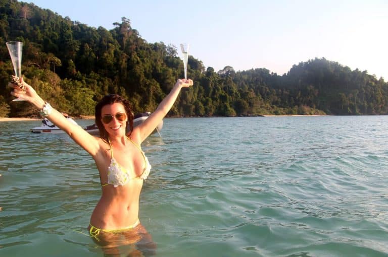 Sanook’s large flybridge is perfect for the tropics with a full and half-length removable Bimini. It offers seating for 10+, a spacious sun pad, and a full wet bar with a BBQ griddle. The bow also features ample sun pads, ensuring everyone can bask in the sun or enjoy dolphin watching from the front.