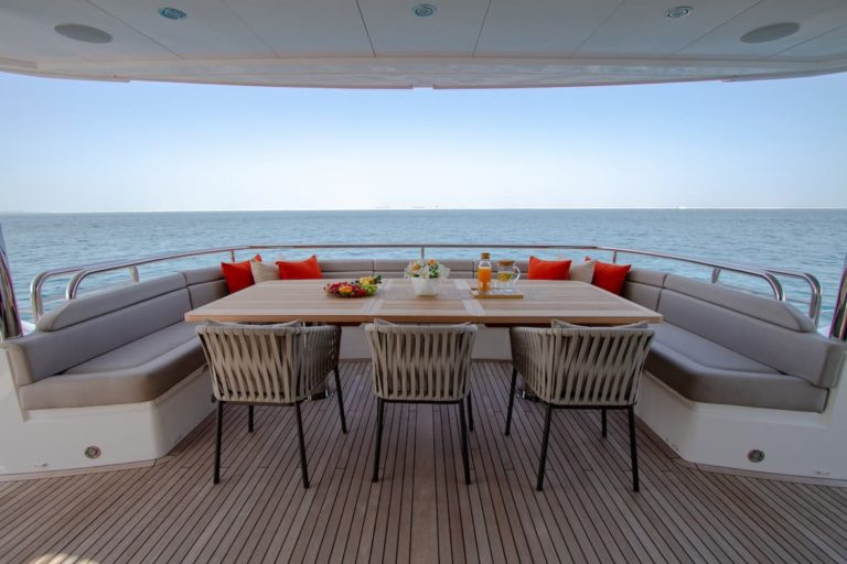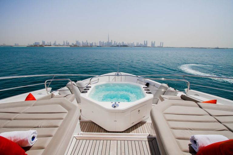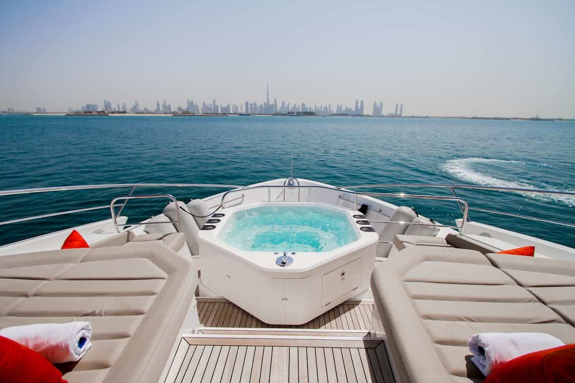 Sunseeker 116 is one of the newest yachts in Dubai, the exterior layout of this yacht makes it a fantastic yacht rental choice for anyone who’s looking to host 20 guests on a sunny day. A large hot tub can be found on the foredeck, and an al fresco sitting and dining area can be found on the flybridge covered by its retractable sunroof.